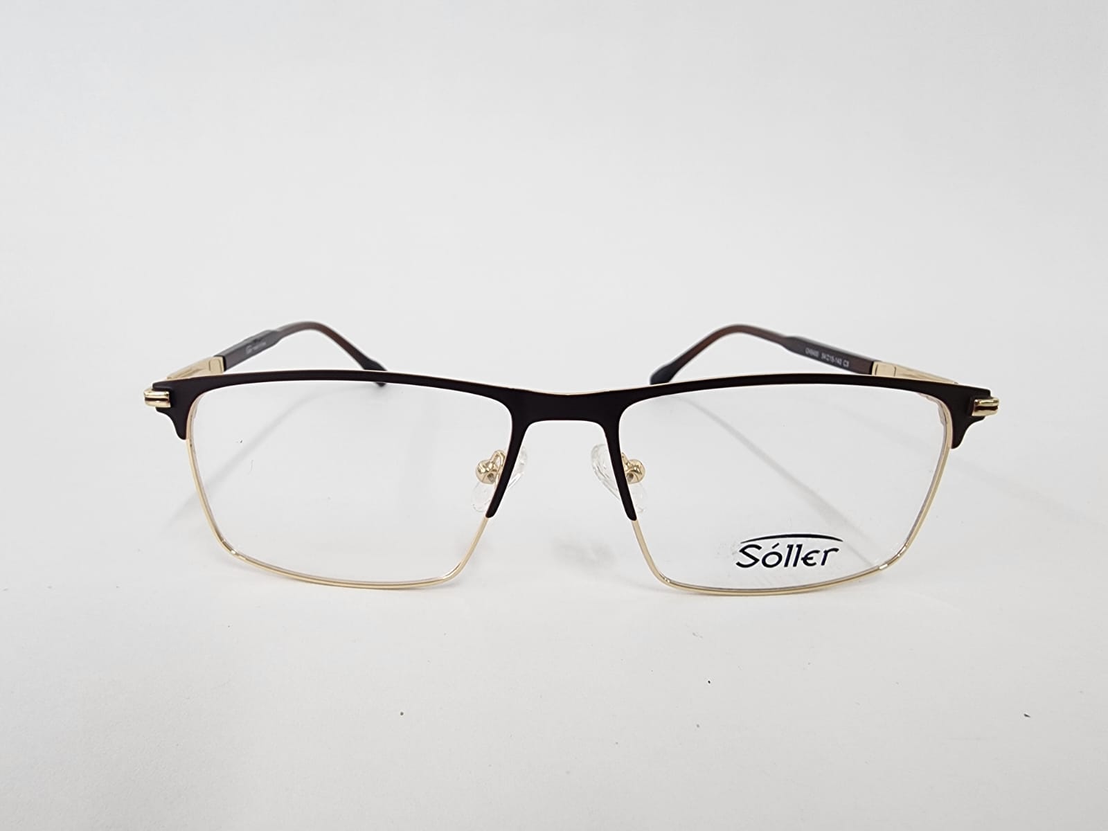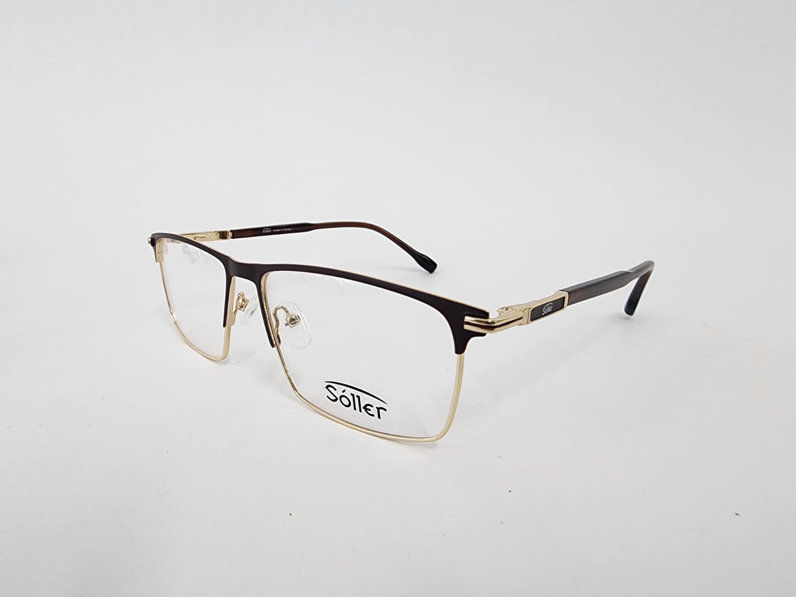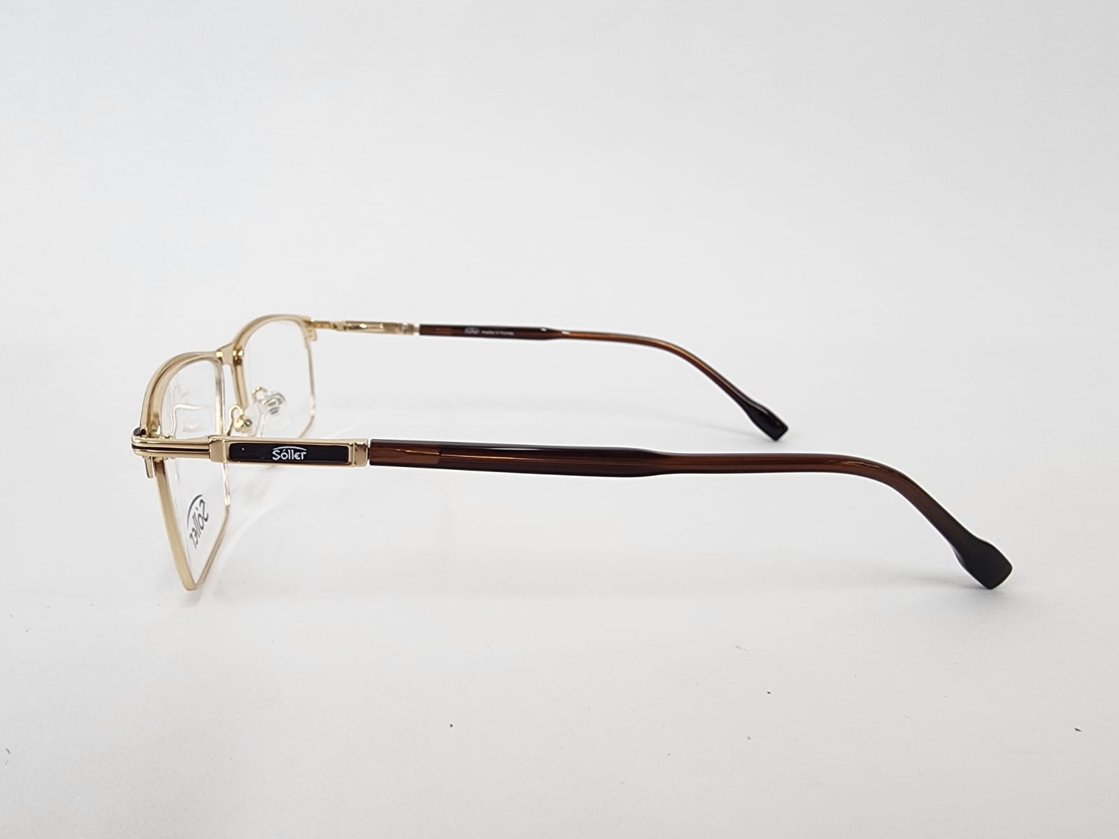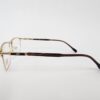 Montura metalica en dorado con brazos en acabdos en marron con forma rectangular.