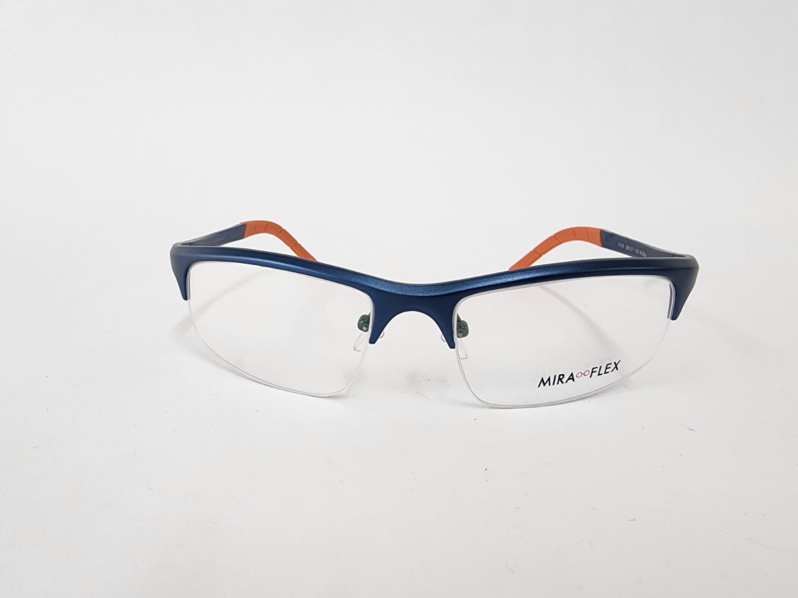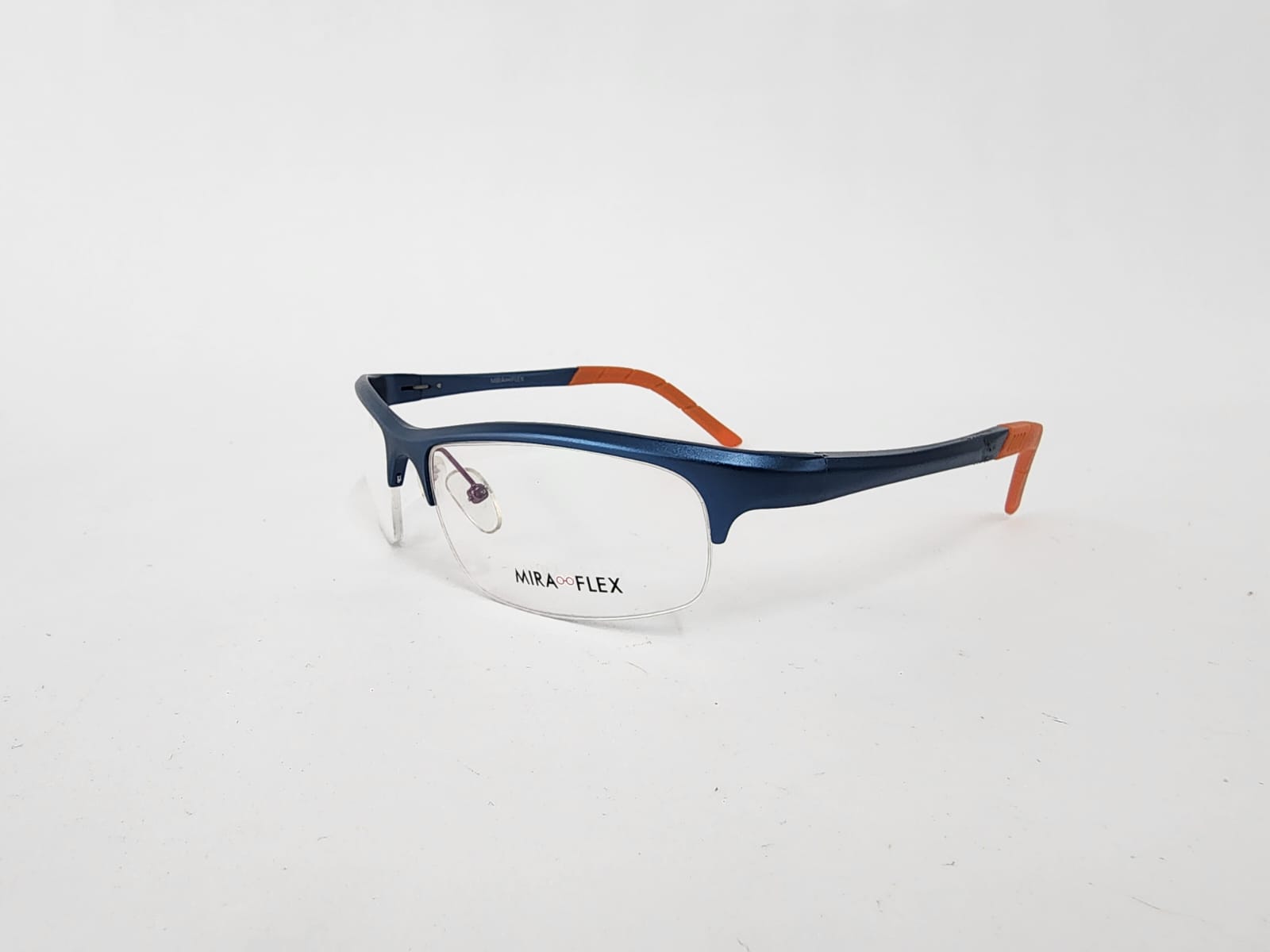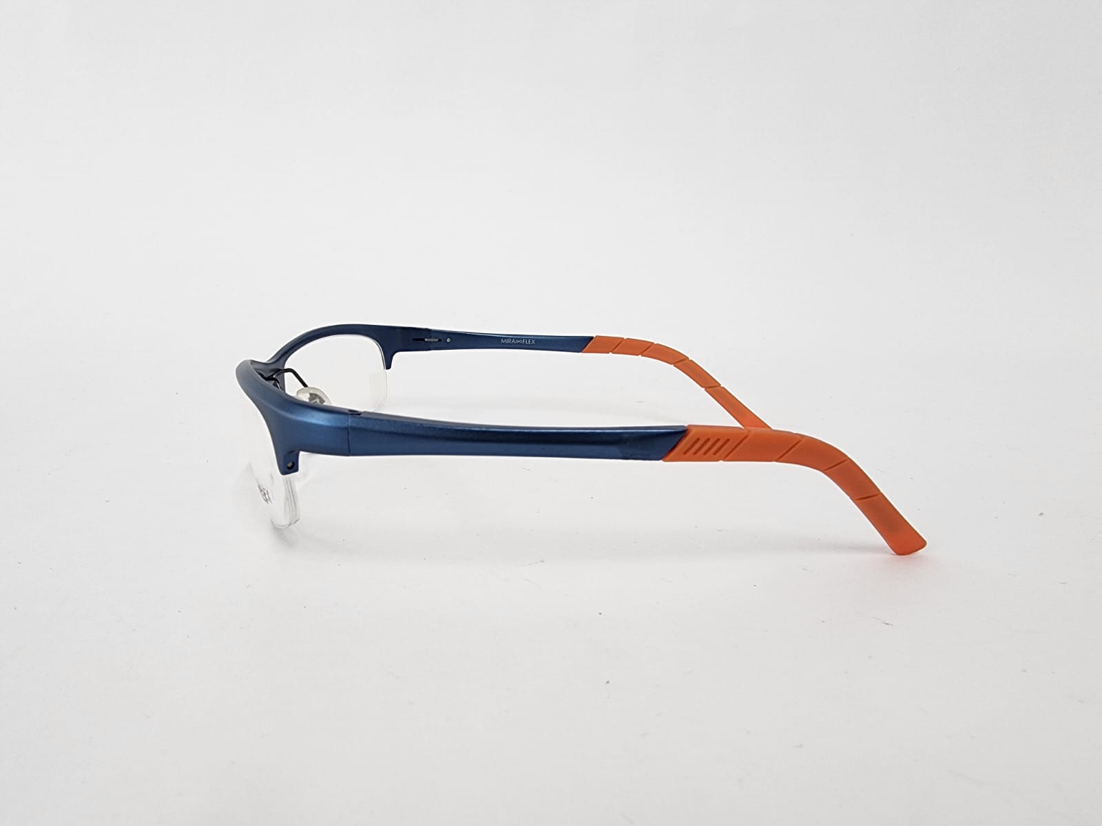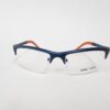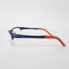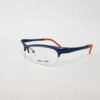 Montura metalica estilo deportivo de color azul con acabados en naranja con forma rectangular.