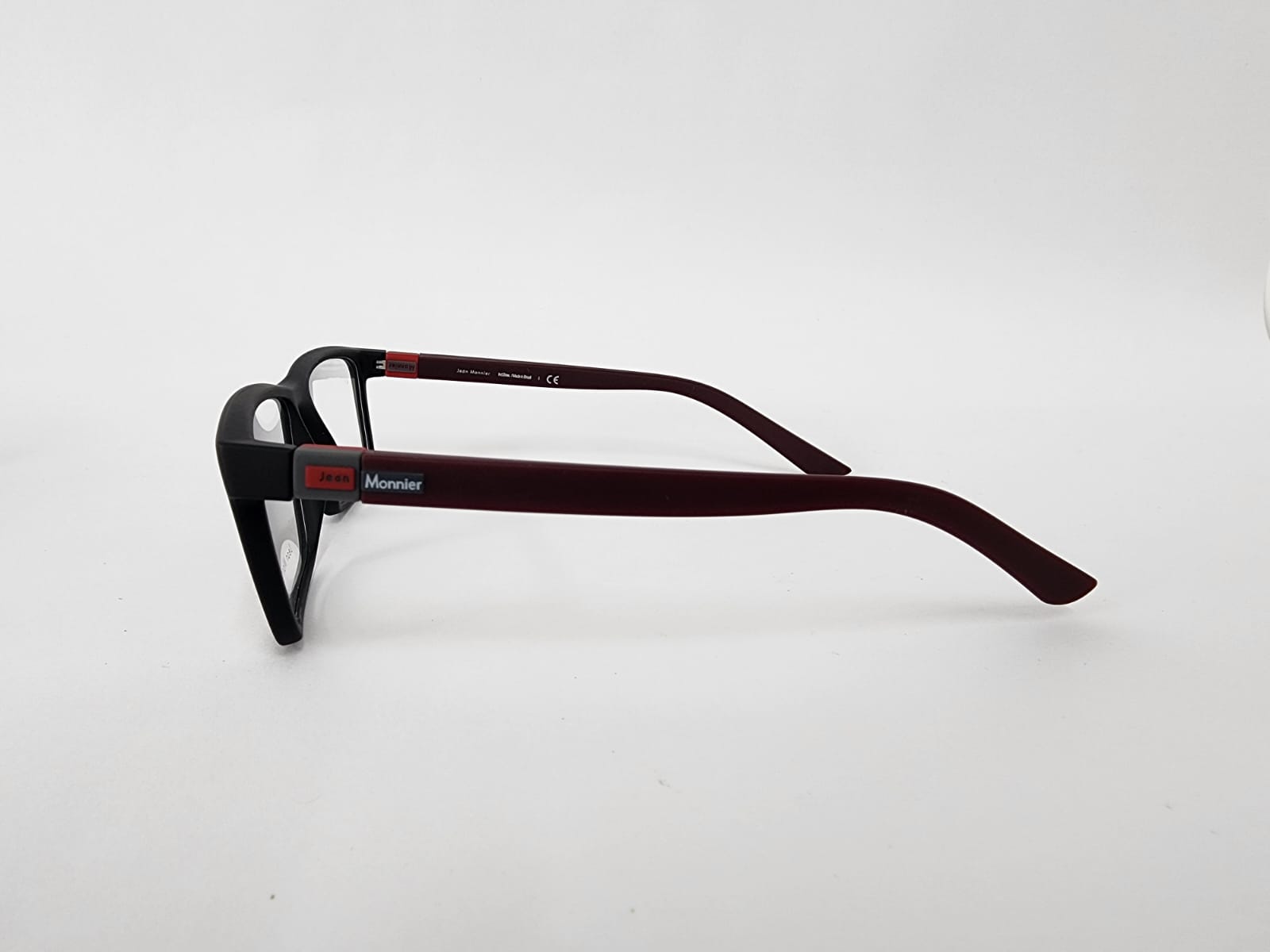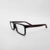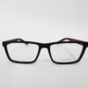 Montura acetato rectangular en negro grafito con brazos en vino tinto, minimalista y ligera, pensada para quienes buscan comodidad y un estilo discreto pero moderno.