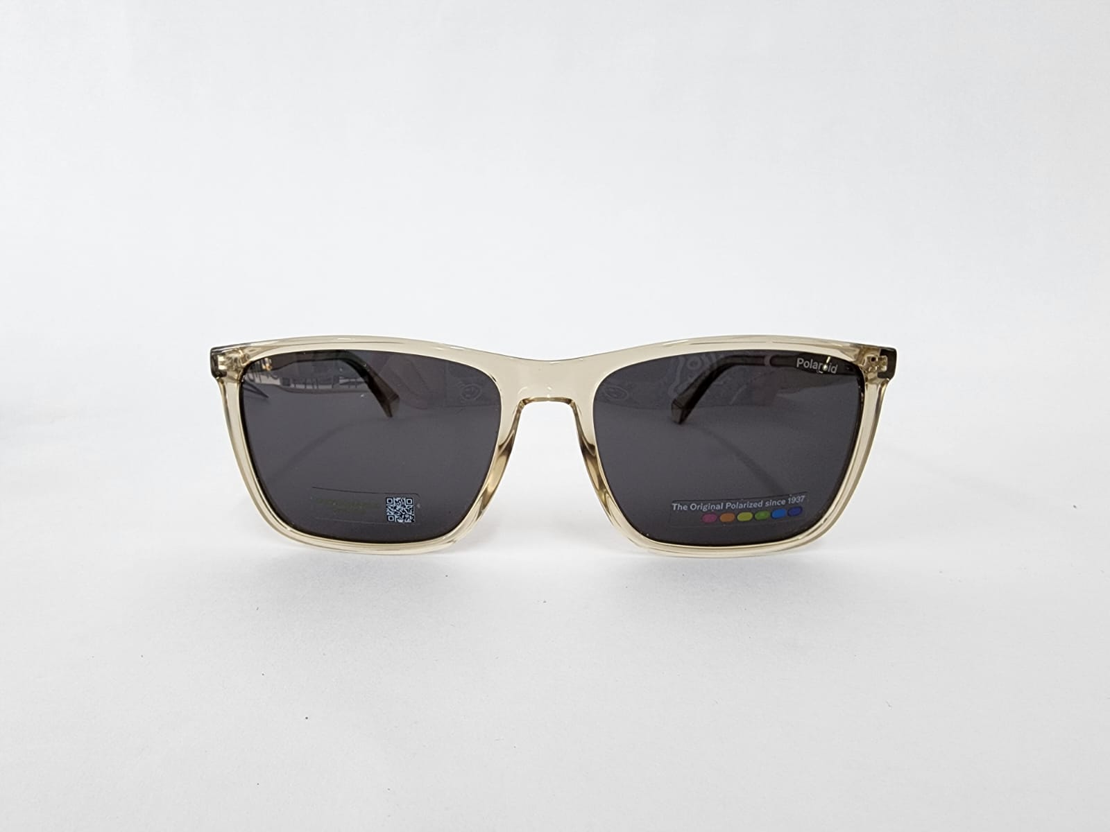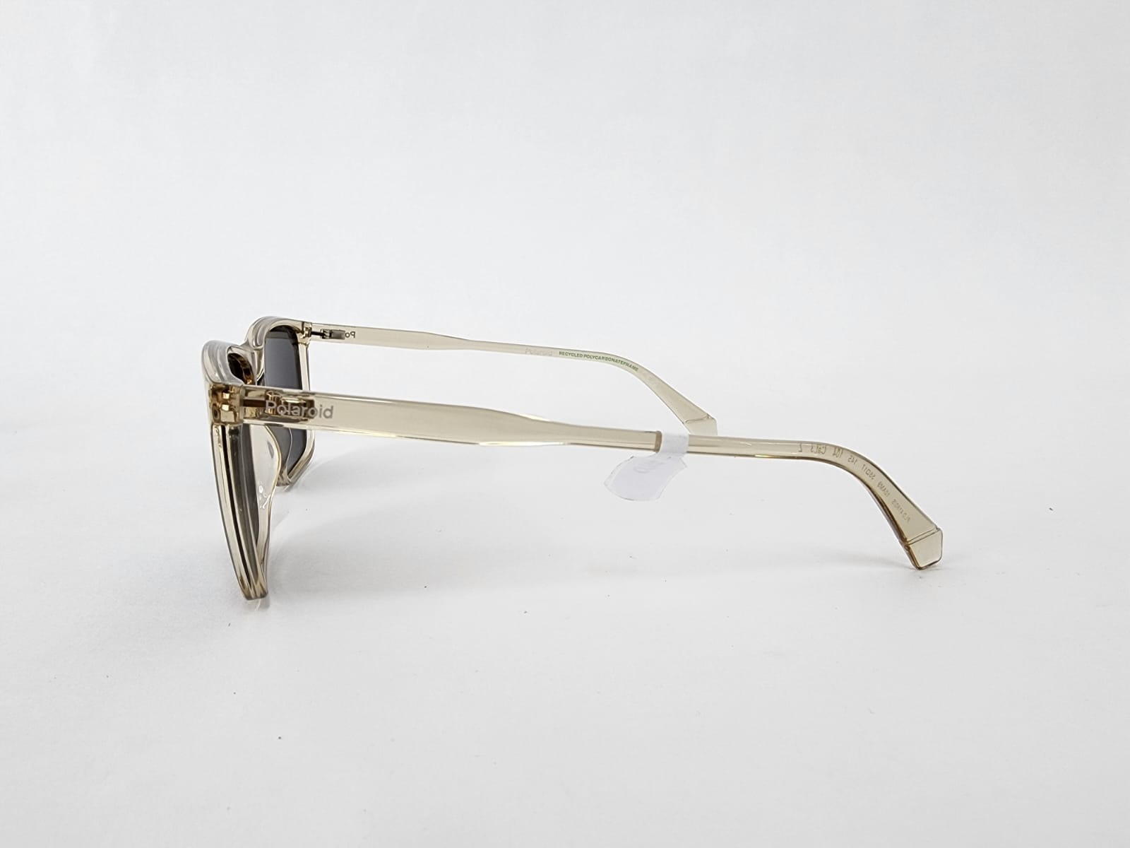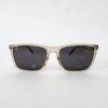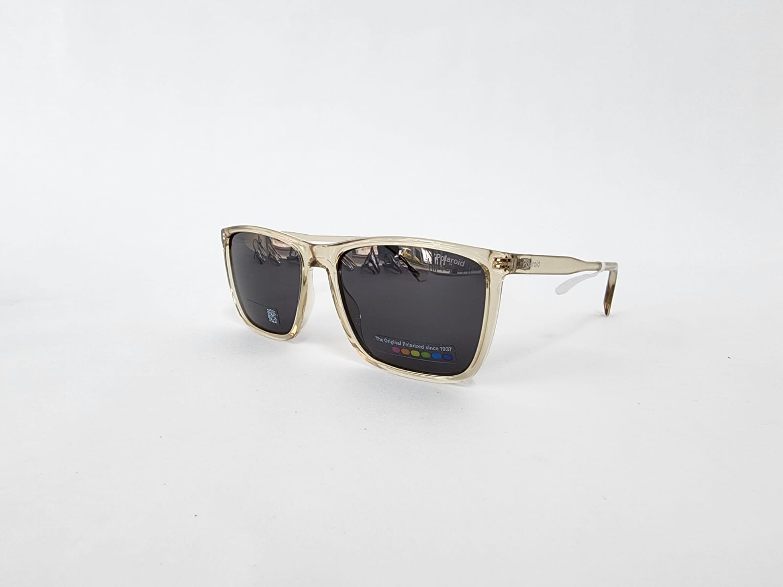 Gafas de sol rectangulares en beige translúcido con lentes polarizadas grises. Diseño clásico y elegante, con protección UV y gran ligereza — ideales para el uso diario con un toque sofisticado.