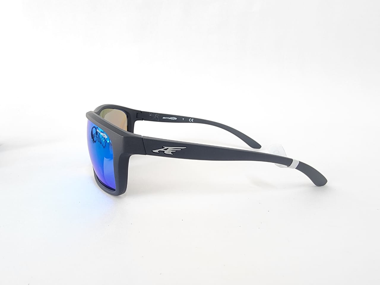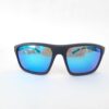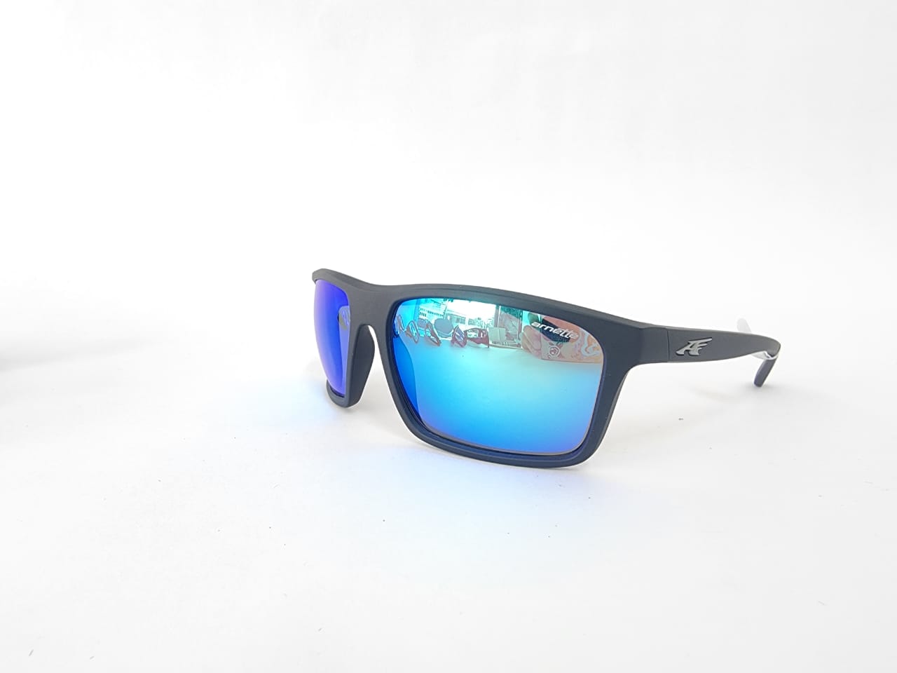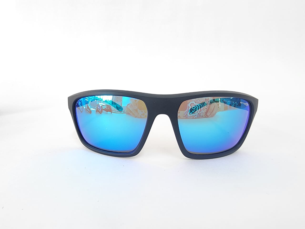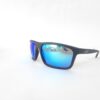 Gafas de sol deportivas envolventes con estilo urbano; estructura en negro mate y lentes espejados azules para máxima protección UV400. Perfectas para un estilo activo y moderno