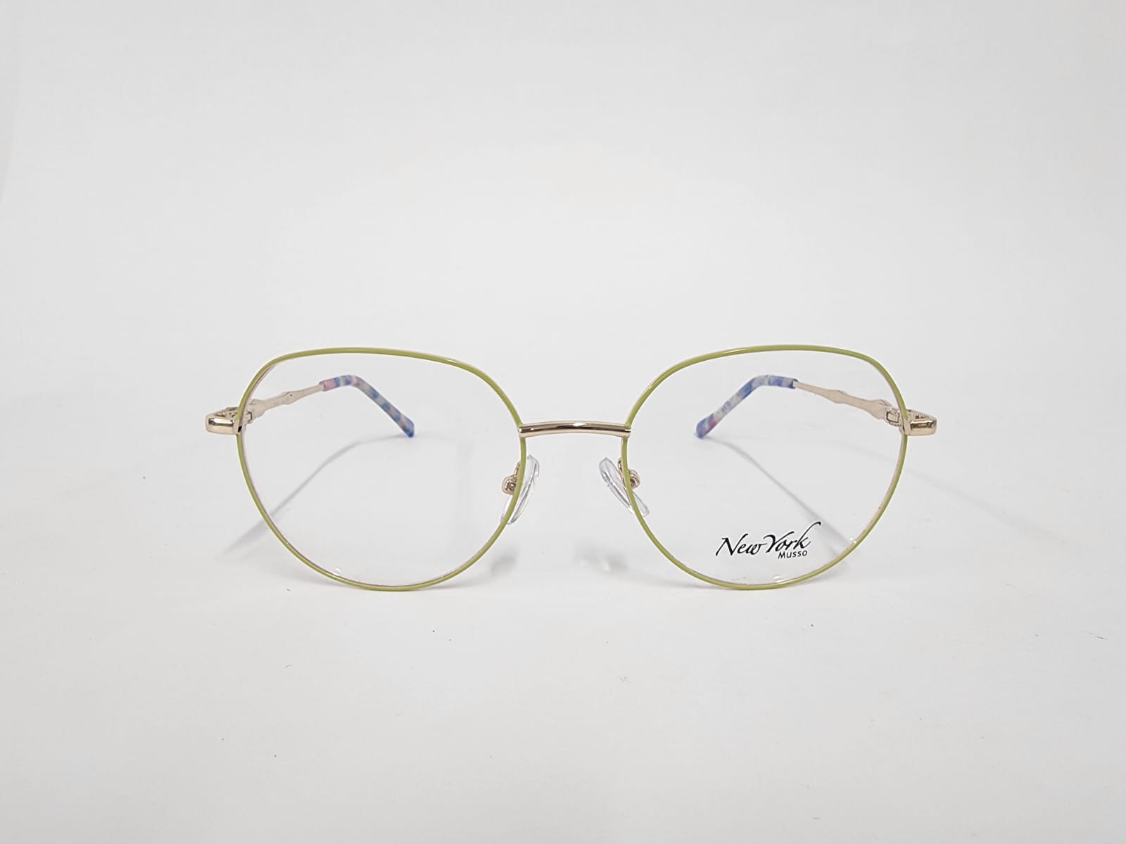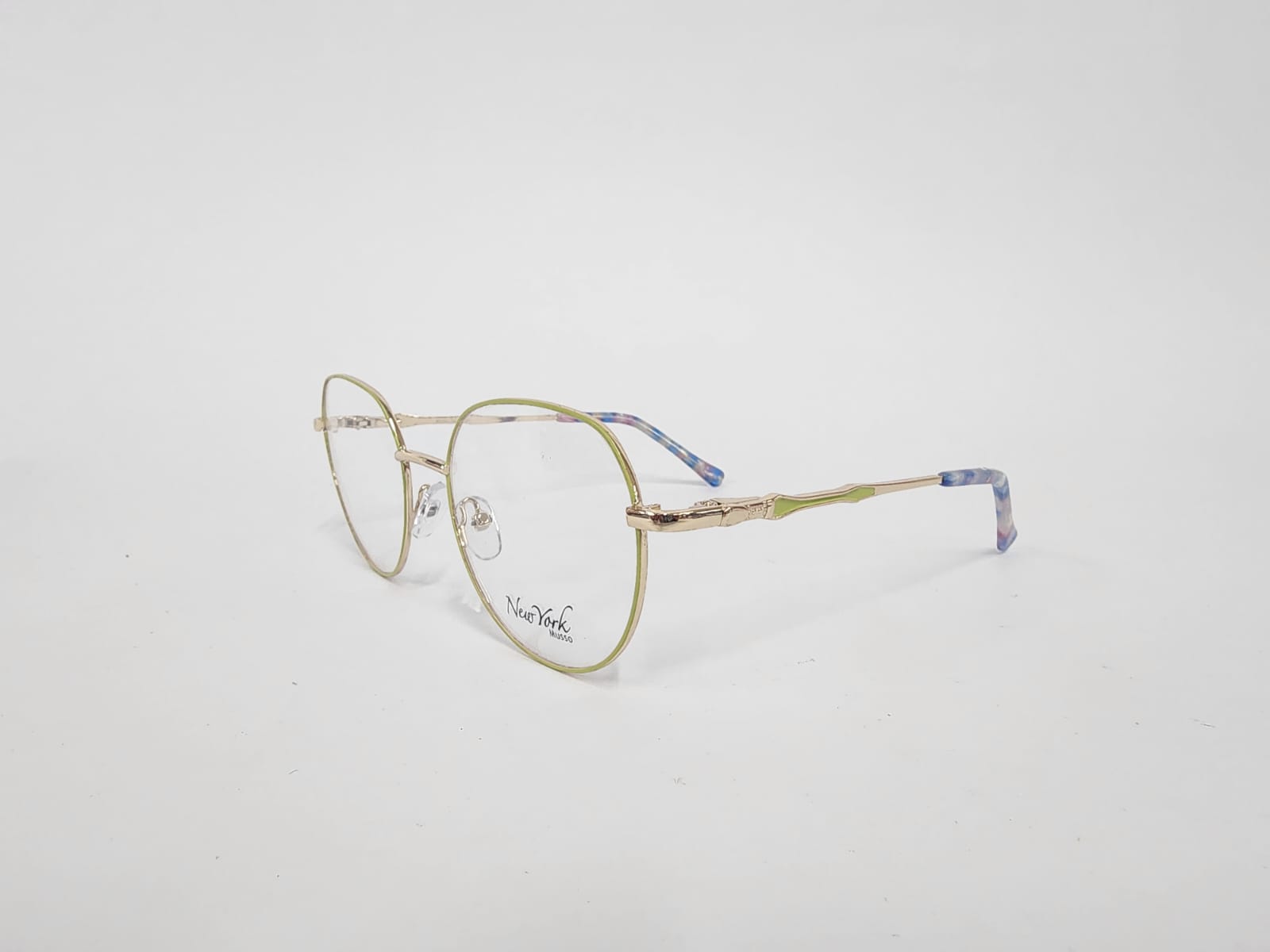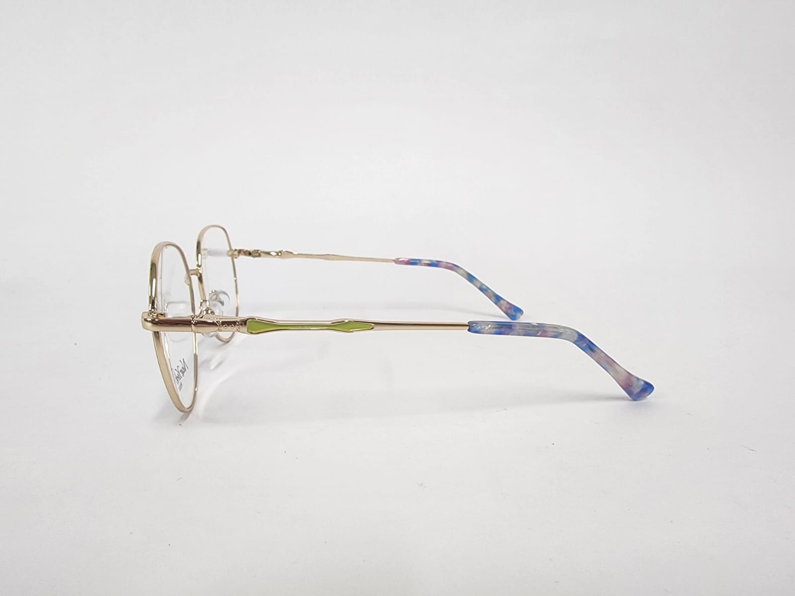 Montura metalica ,de color amarilllo con brazos en carey forma ovalada