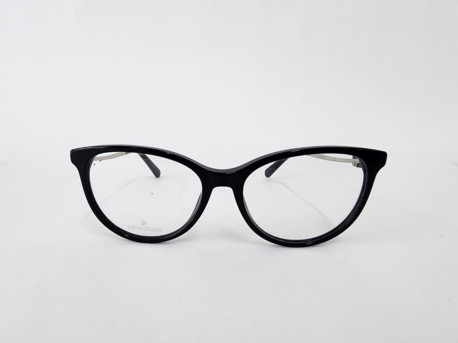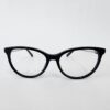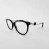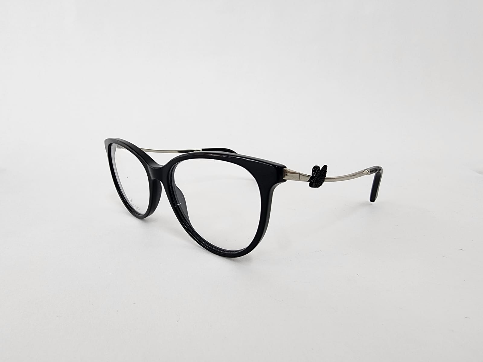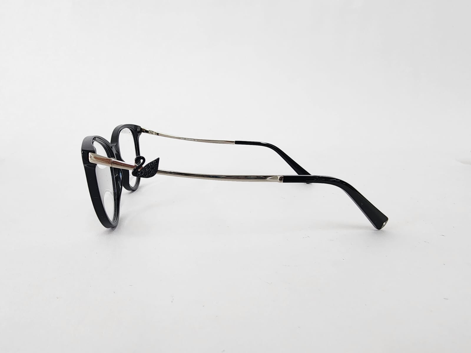 Montura elegante en acetato negro brillante con forma ovalada, decorada con sutiles detalles Swarovski en las varillas, ideal para un estilo sofisticado y femenino.