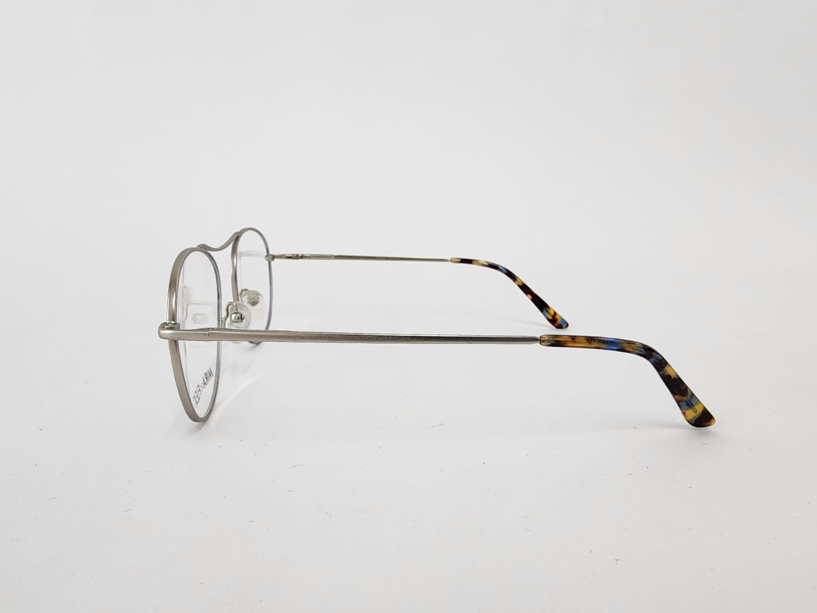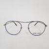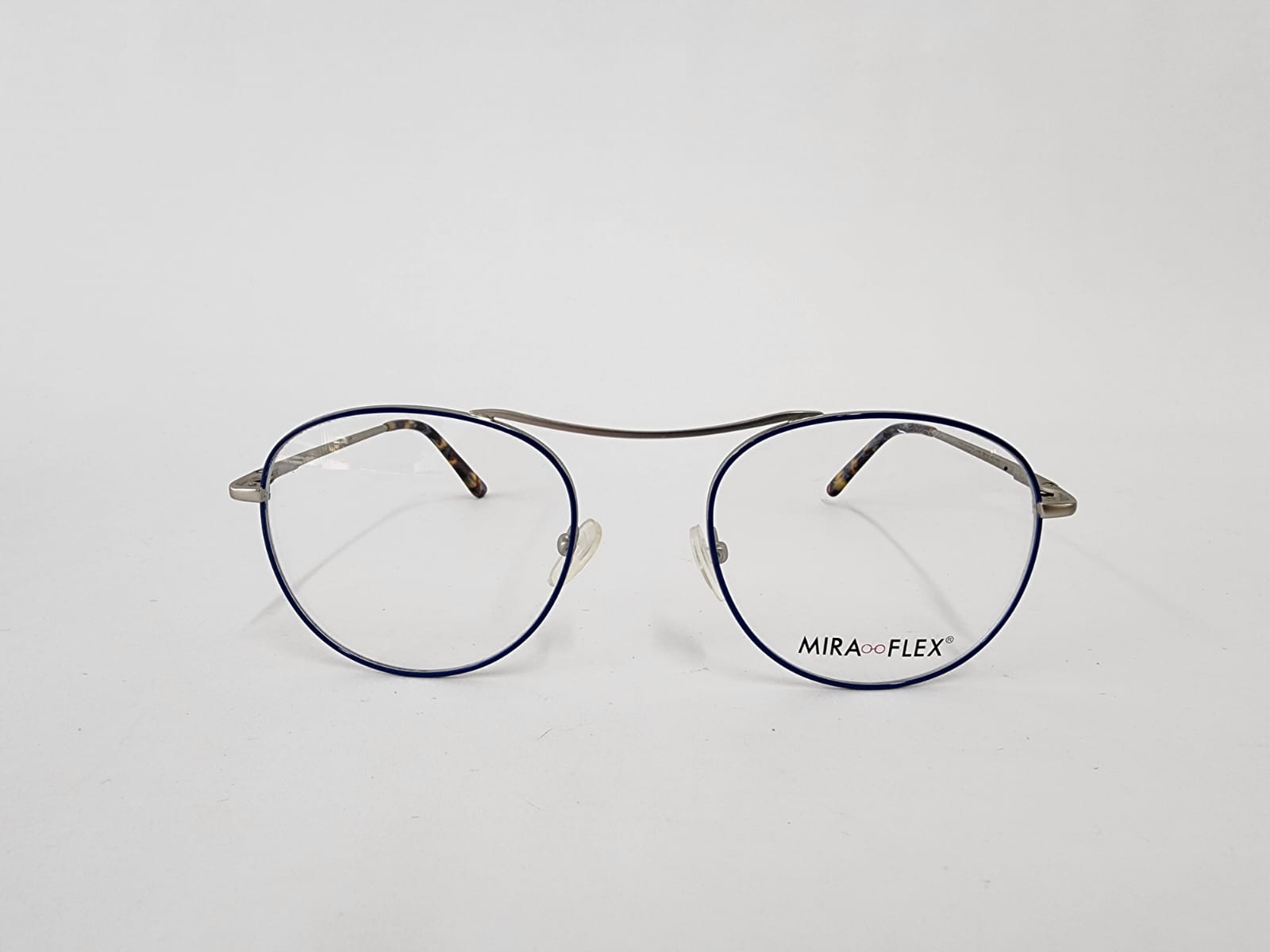 Montura metalica de color azul en la frontal ,con forma redonda.