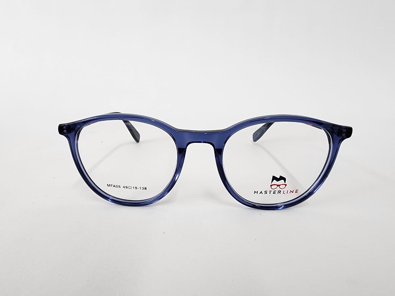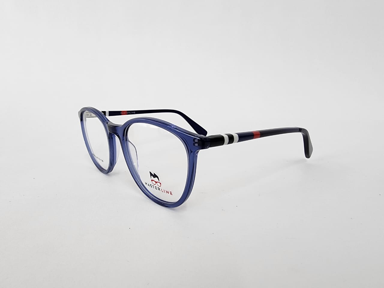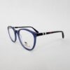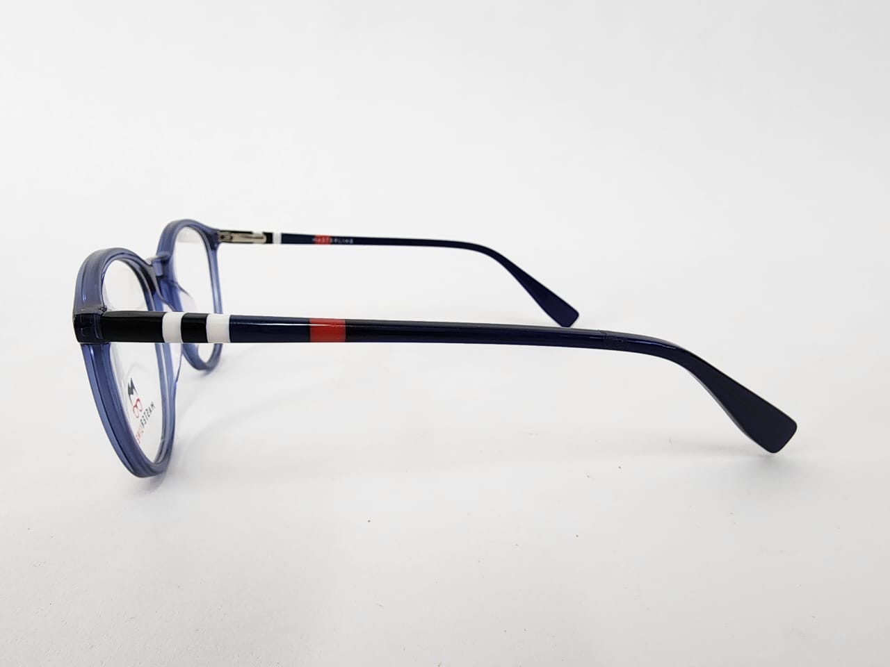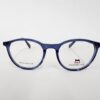 Montura aro redondo acetato azul translucido brazo azul oscuro combinado con franjas blancas y negras.