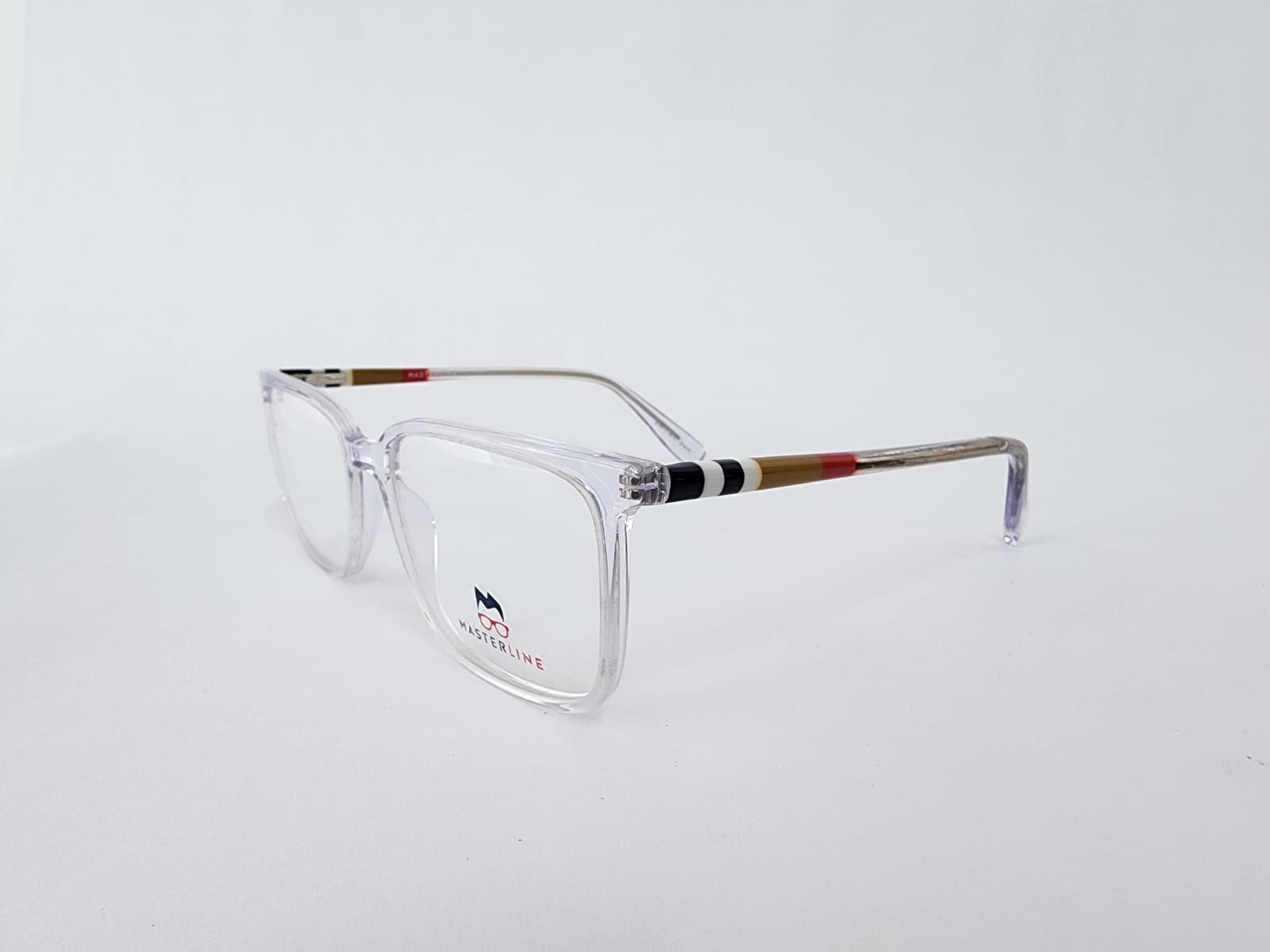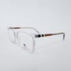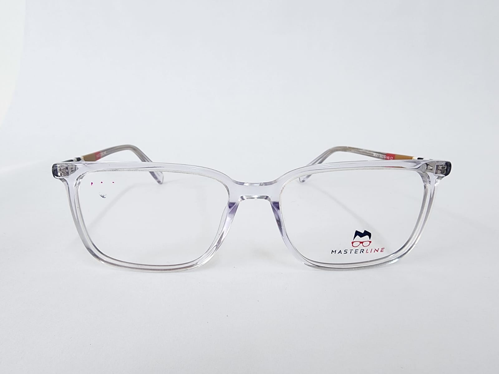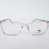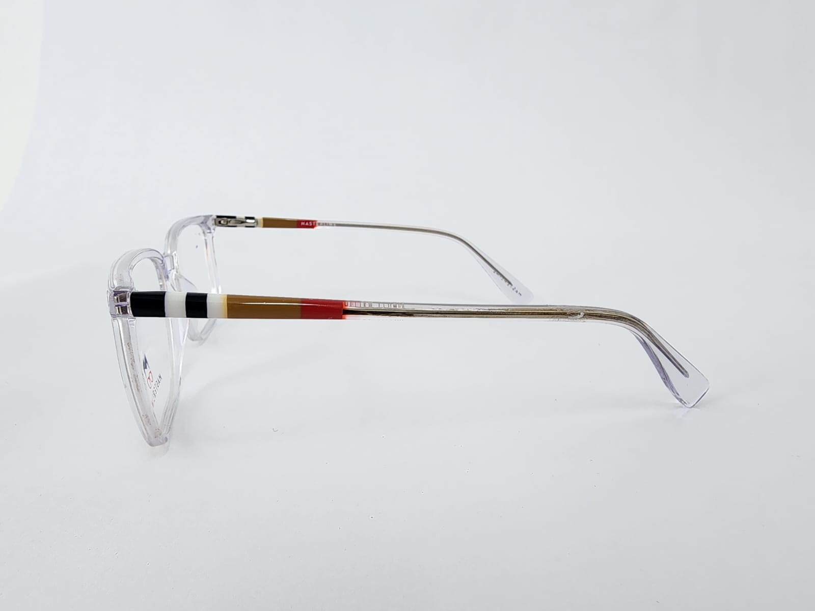 Montura de caetato de color transparente y azul , con acabados en multicolor en los brazos forma cuadrada.