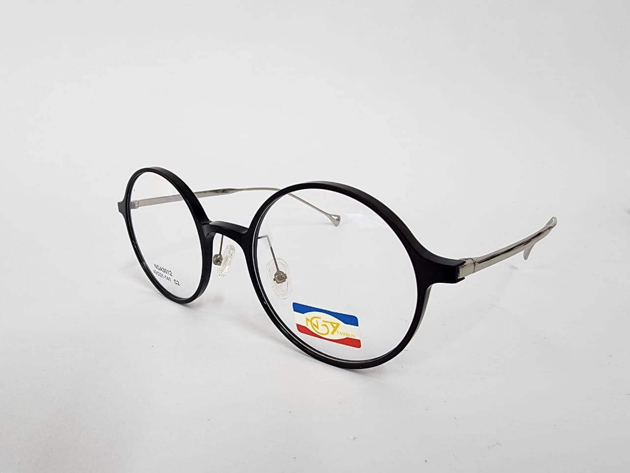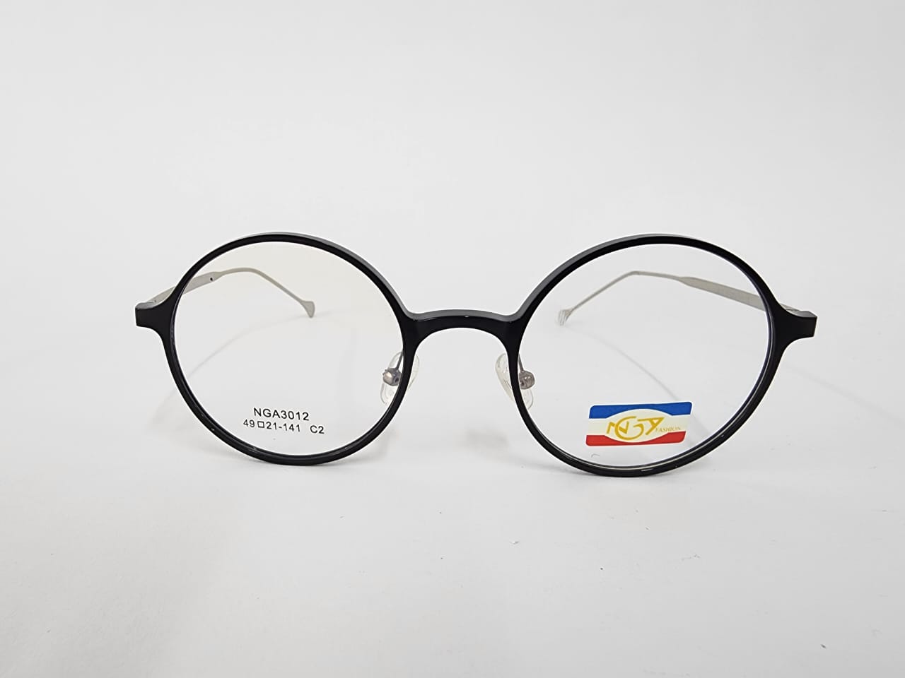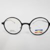 Montura de acetato co frontal redonda ,color negro con brazos metalicos.