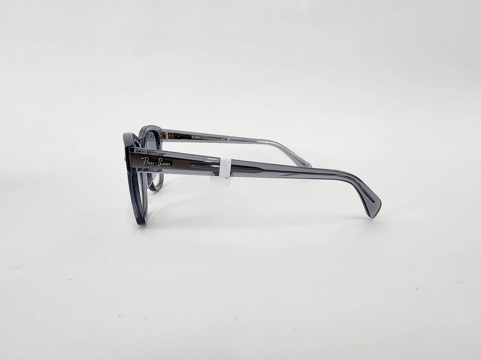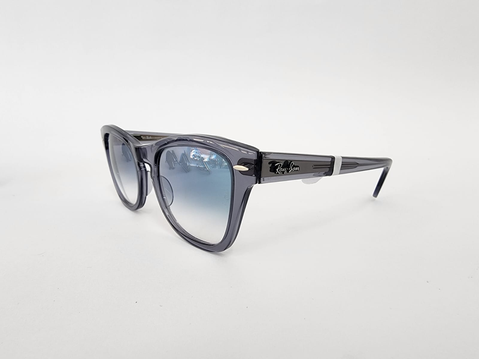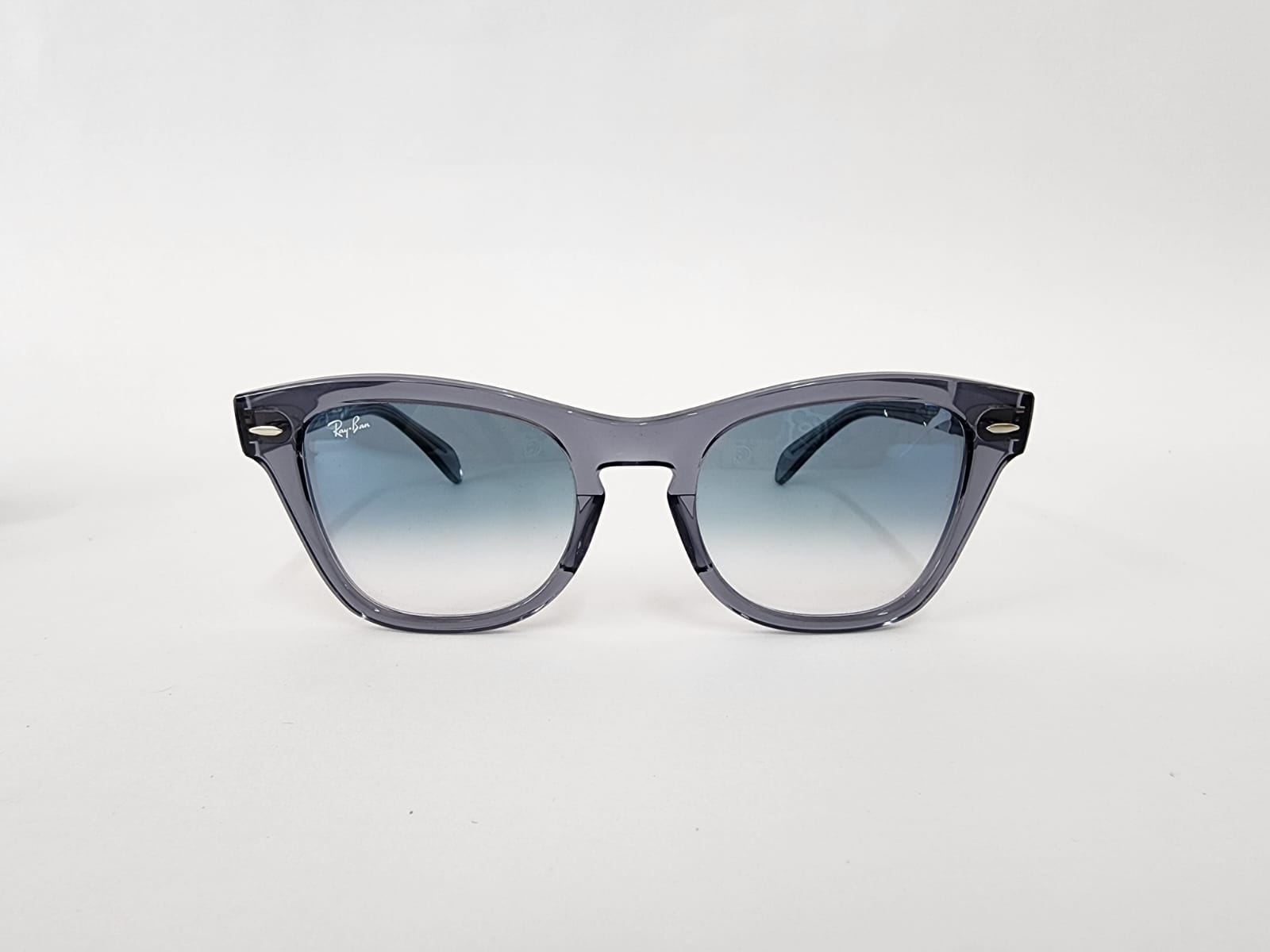 Diseño cuadrado compacto en acetato gris cristal transparente con puente keyhole. Lentes azul degradado a claro, perfectas para un look retro y fresco.